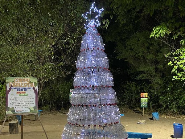Toda a ornamentação foi feita com matérias reutilizados, com foco nas garrafas PETs na qual foram utilizadas mais de seiscentas.