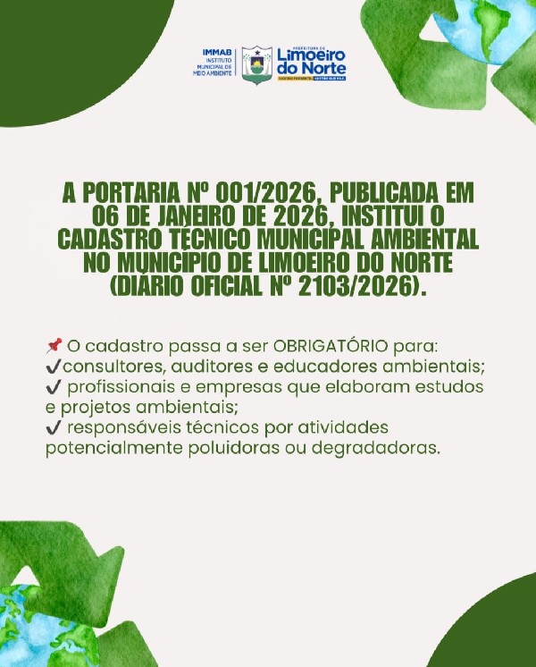 * A Portaria n° 001/2026, publicada em 06 de janeiro de 2026, no Diário Oficial do Município, institui o Cadastro Técnico Municipal Ambiental no Município de Limoeiro do Norte. Ela estabelece os critérios e procedimentos básicos para a implementação do Cadastro para aqueles que atuam como consultores ambientais, auditores ambientais e educadores na elaboração de estudos e projetos ambientais, bem como que aqueles que representem tecnicamente atividades e serviços potencialmente poluidores ou degradadores, no âmbito do Município de Limoeiro do Norte.