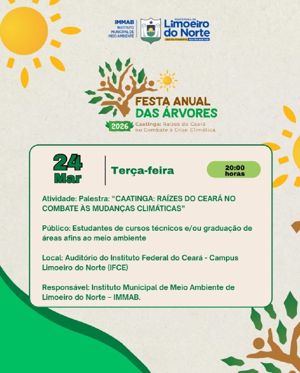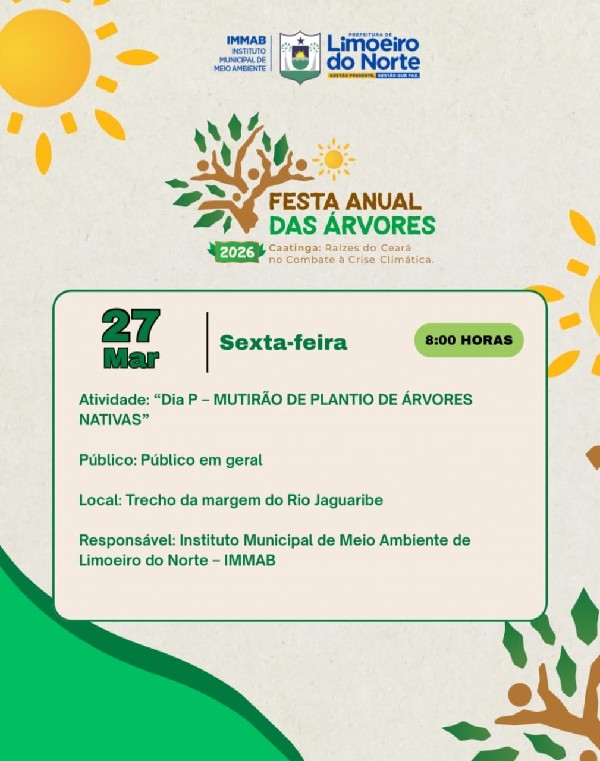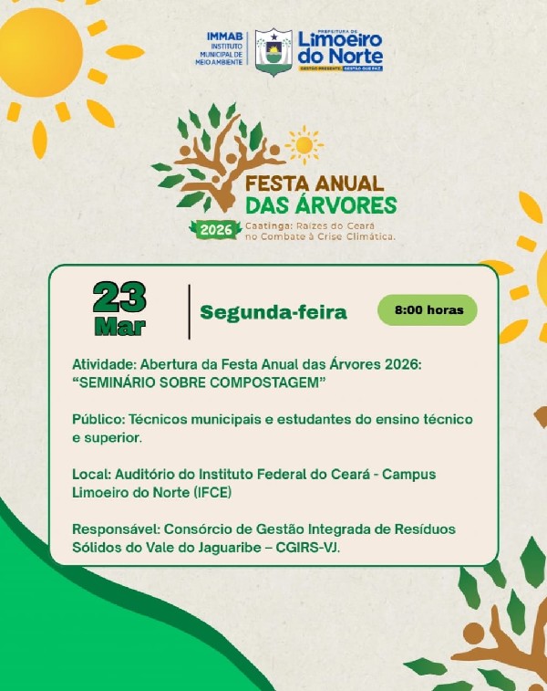O Instituto Municipal de Meio Ambiente - IMMAB, em parceria com a Secretaria de Meio Ambiente e Mudança do Clima do Estado do Ceará - SEMA, convida você para participar da "FAA 2026"